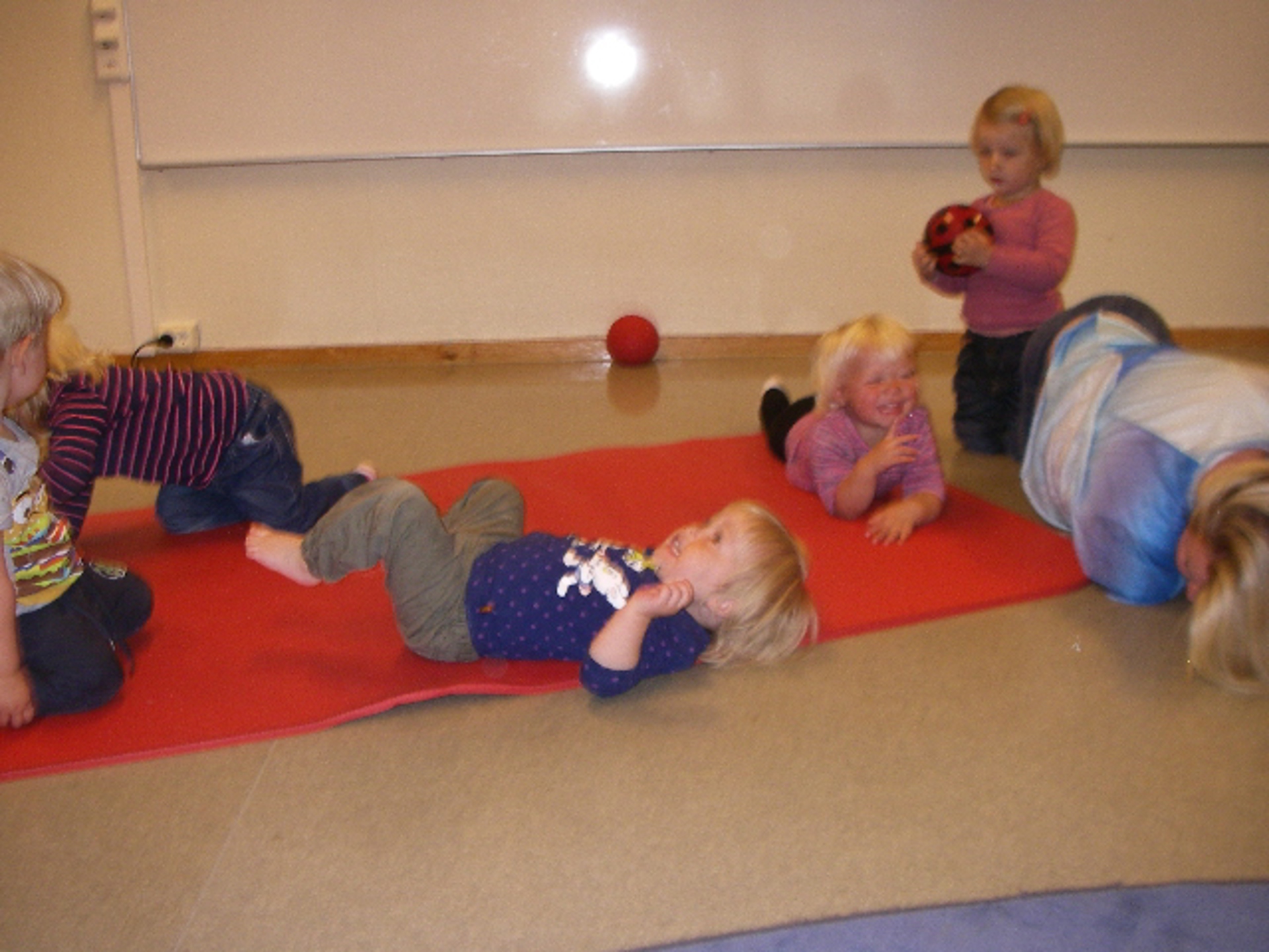 Det ble høyt aktivitetsnivå på gymrommet i dag da noen av de yngste i barnehagen fikk boltre seg der. Mattene ble brukt aktivt til å rulle som pølser. I krabbetunnelen trillet vi ball igjennom og krøp etter selv. På tjukkasen hoppet vi mens vi sa "Epler og pærer ..." og ramlet ned som moden frukt - gjerne før regla var ferdig. Og da ble vi plutselig "Troll i esken"
