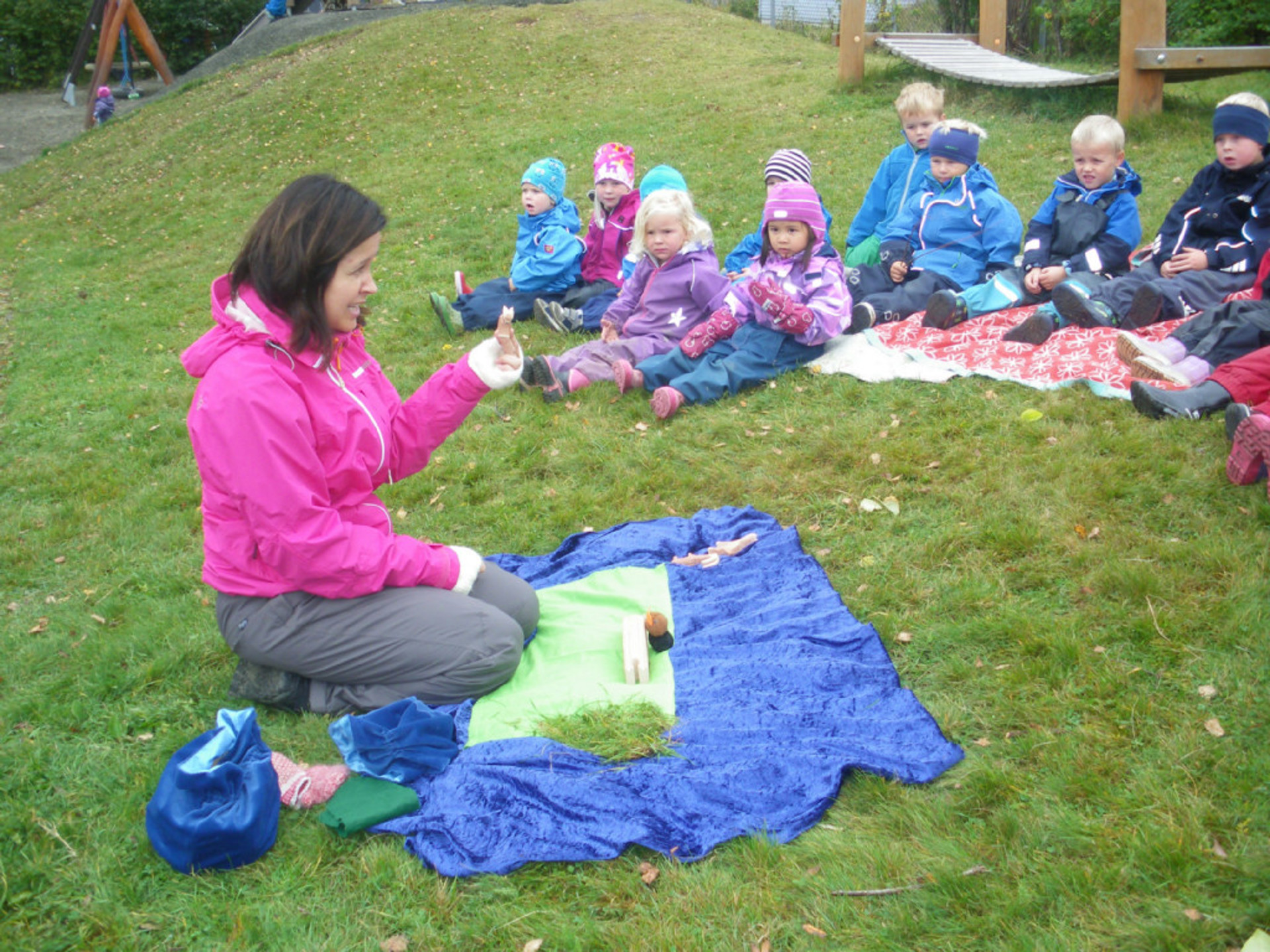 Litt oppi gressbakken var det eventyrstund, og de som flokket seg sammen der fikk høre både eventyret om "De tre bukkene Bruse" og "Gullhår og de tre bjørnene". Eventyrene ble ikke bare gjenfortalt, men vist med figurer så eventyrene ble ekstra spennende.